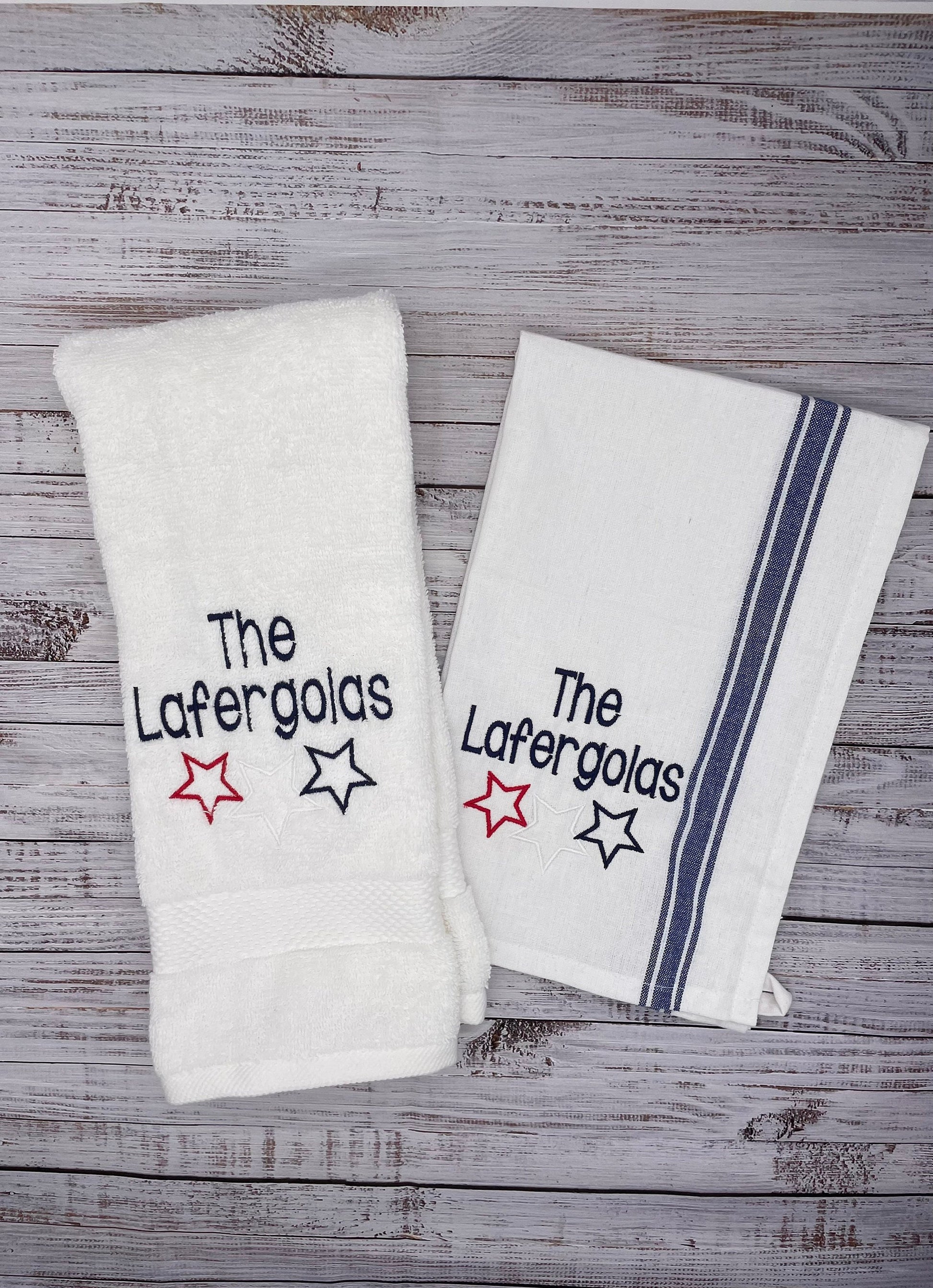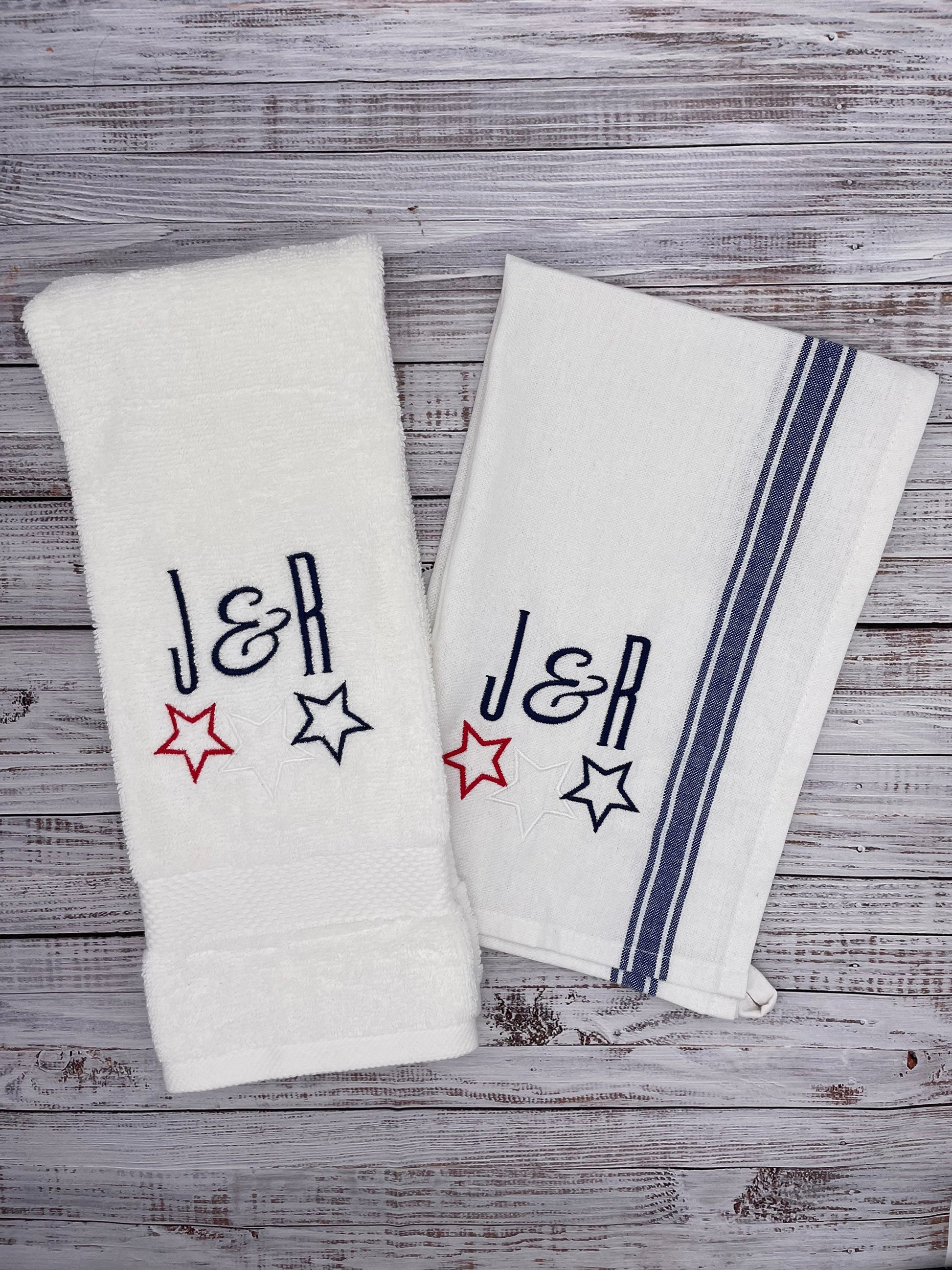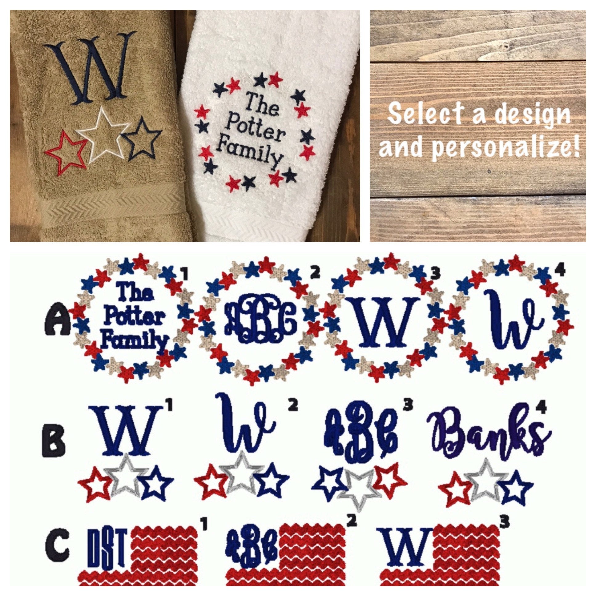 Decorate the bathroom or boat with embroidered patriotic personalized bathroom towels! These functional towels offer style, convenience and comfort. You get to completely personalize the look. Check out my other listings for Holiday bath towels and basic monogrammed bath towels! We also have kitchen towels as well.