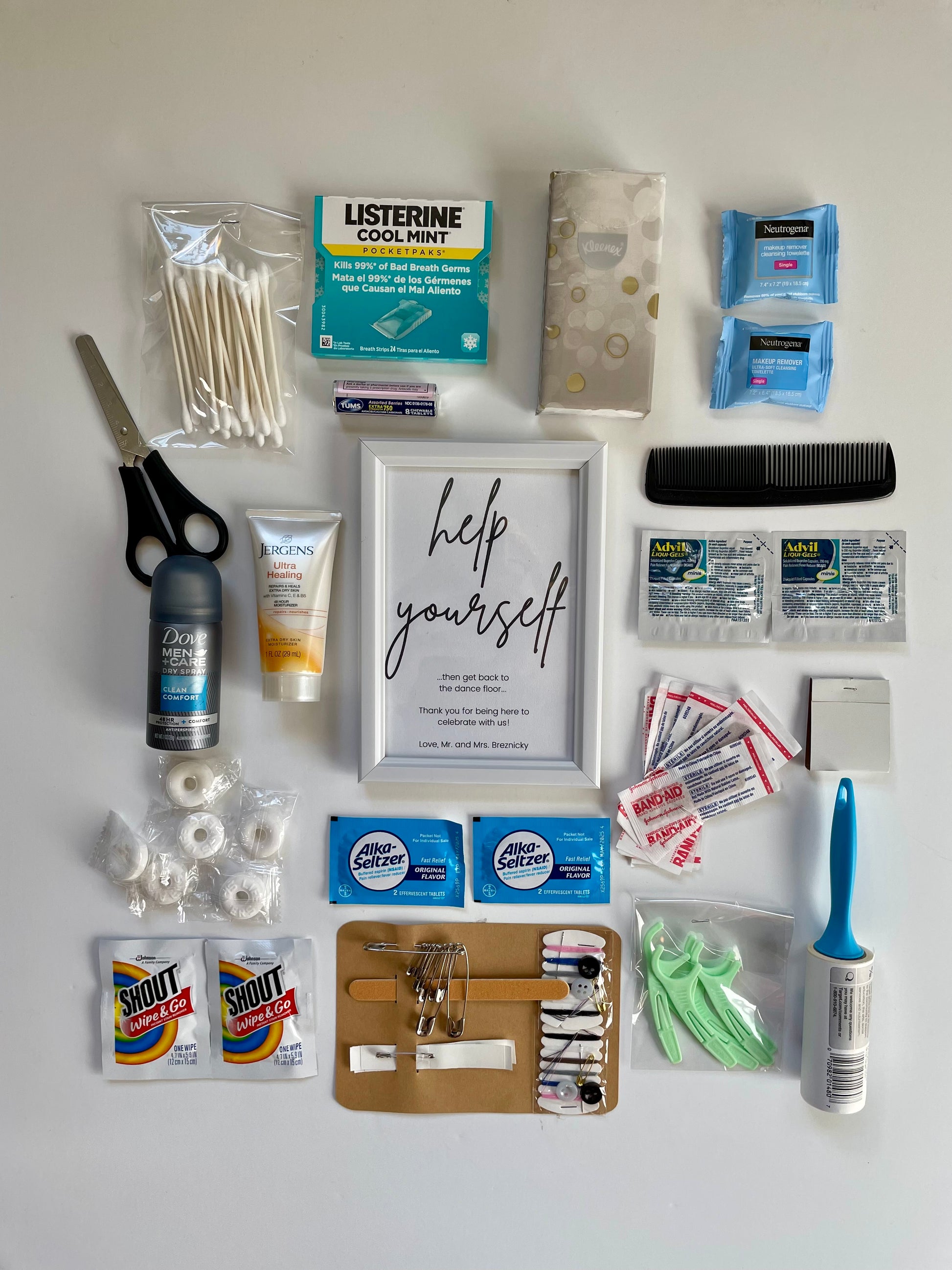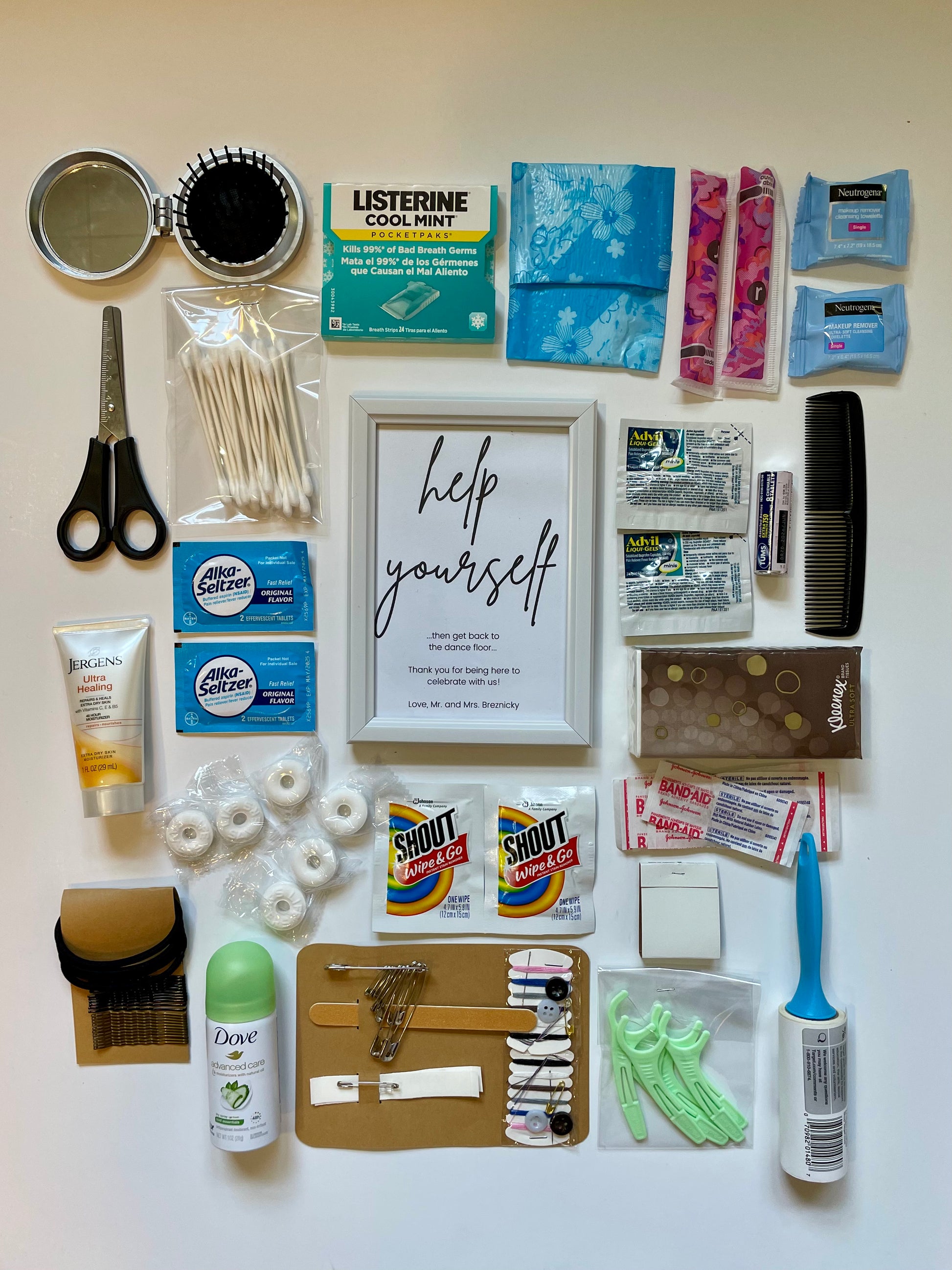 This basket has it all! 30 different items for those last minute needs! This kit has been curated after years of experience of being a bridesmaid! The included items are the must haves for the bathroom. The basket will come with a 4x6” frame that has a custom message inside!