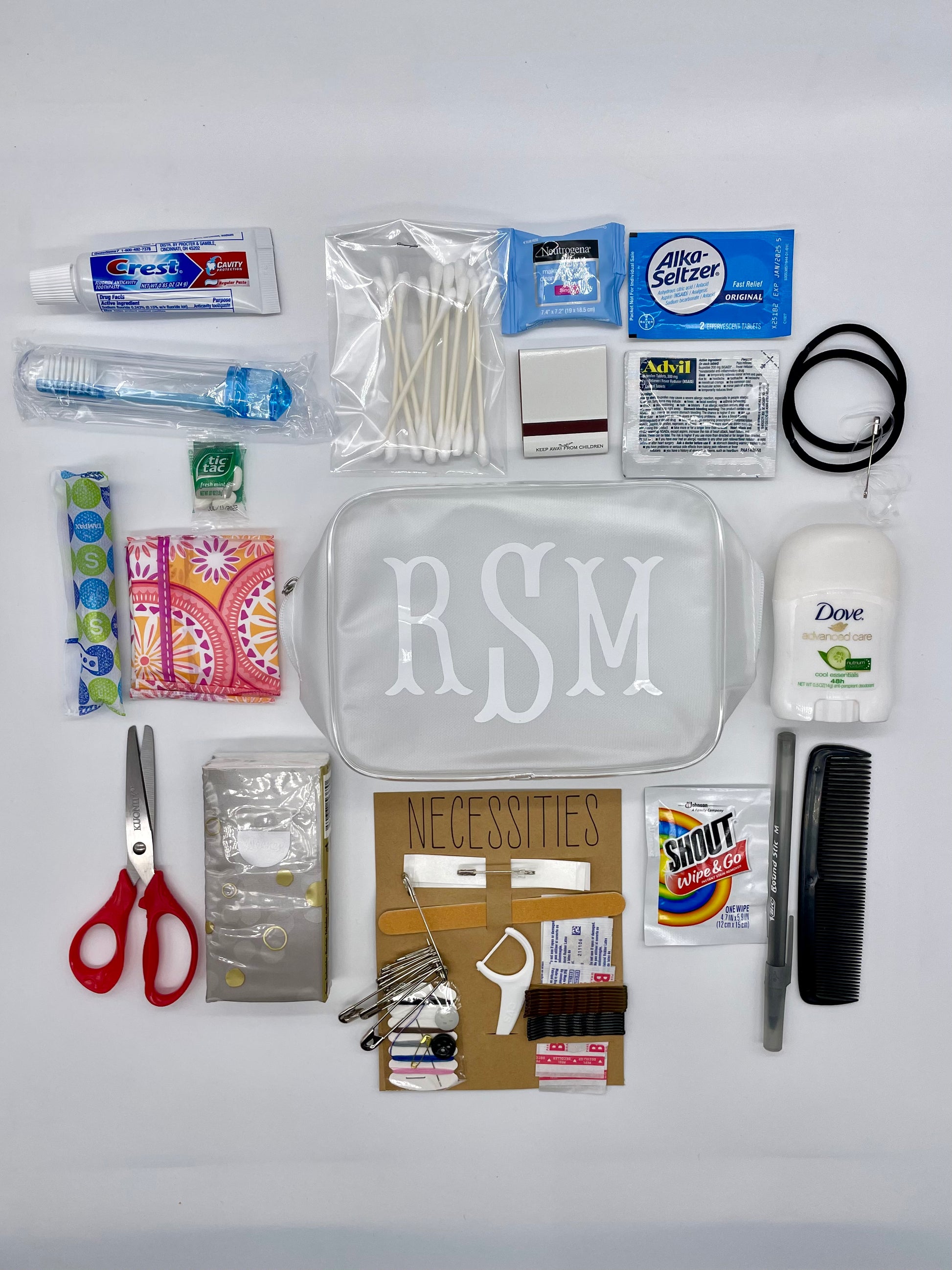 This tote has it all! 27 different items for those last minute needs! This kit has been curated after years of experience of being a bridesmaid! The included items are the must haves for a wedding day emergency kit!! The tote will come personalized with a monogram, name or design of your choosing. The clear tote is great to use for makeup, sunscreen, or other items after it’s used as the emergency kit. The clear pouch allows for an easy view of the contents.